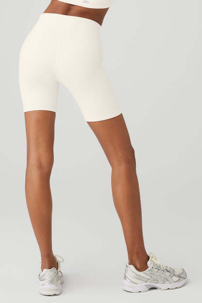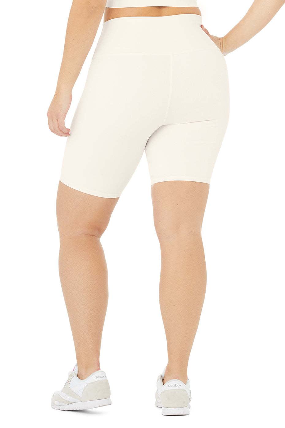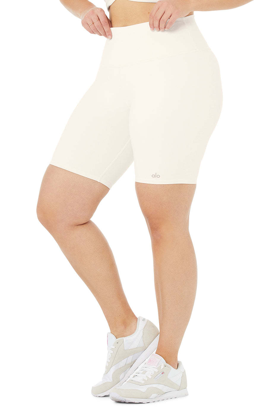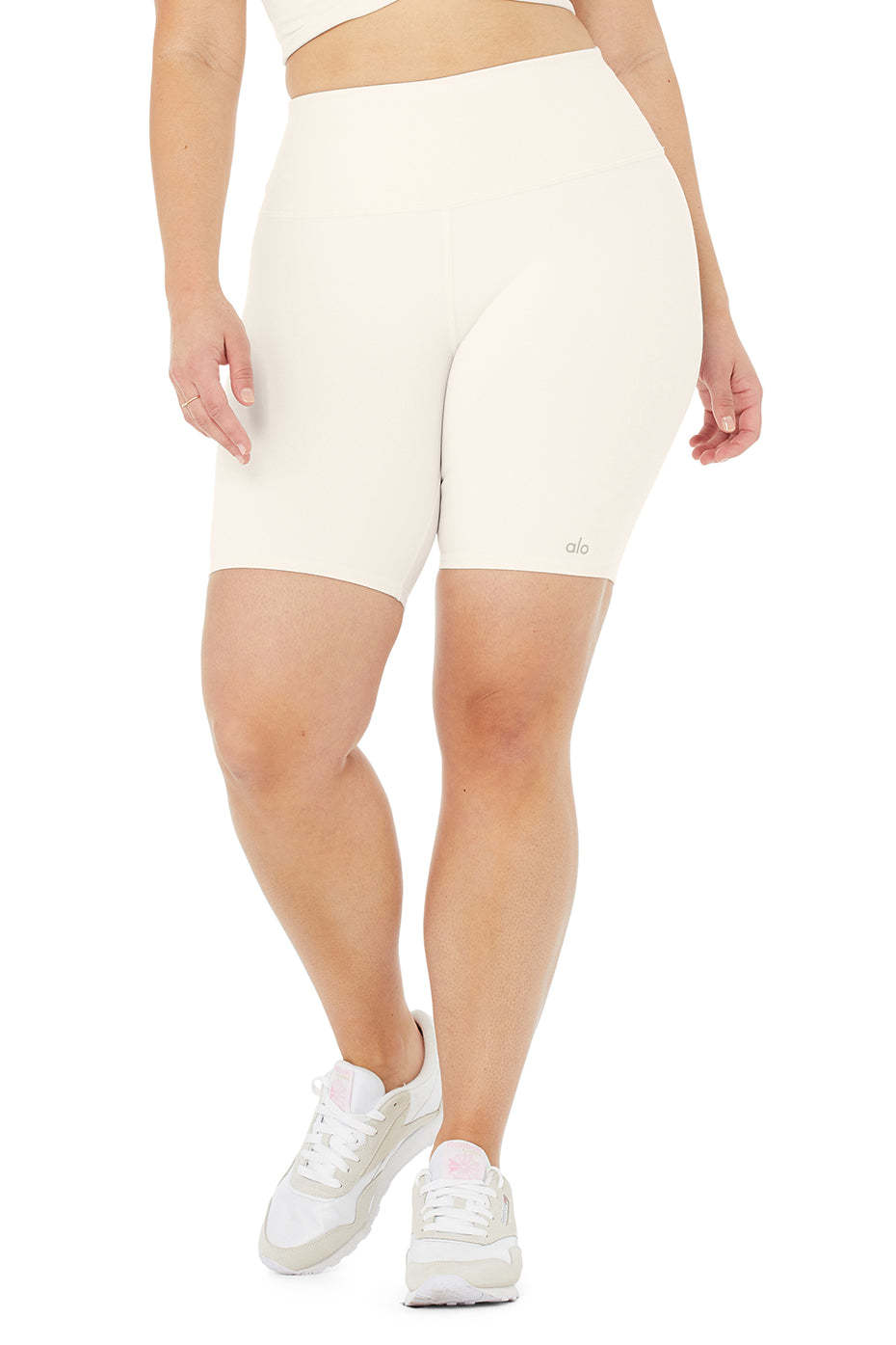 Meet the ultimate short for practice and pavement: the High-Waist Biker Short, made in our signature lifting, sculpting Airbrush fabric, with a high waist, moisture-wicking technology and 4-way stretch that moves with you. Equal parts forward and functional. Wear with a fave bra layered under a cute cropped hoodie or pair with an athelo statement tee.