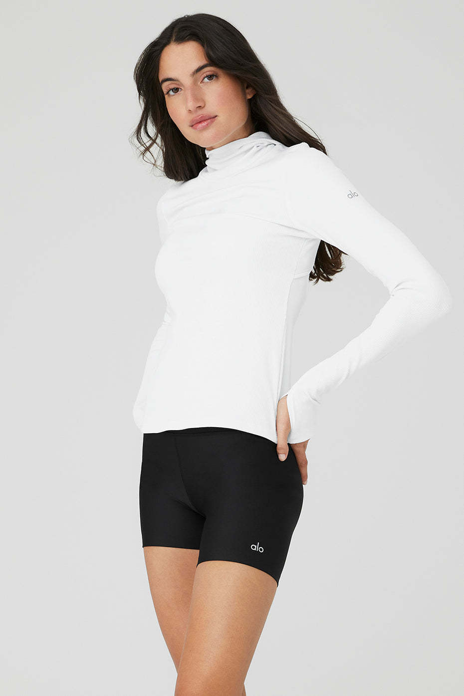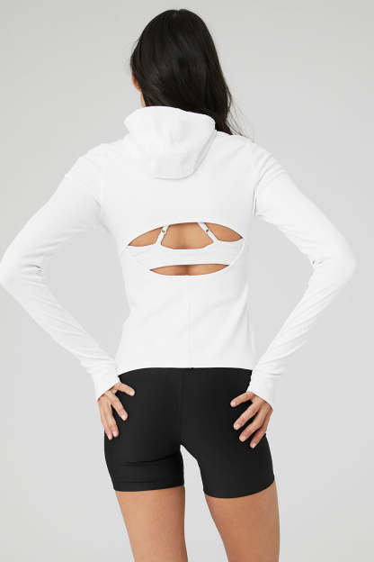 Chilly weather? No problem. Layer up in the athelosoft Ribbed Frontrunner Long Sleeve 〞 a full-length coverup with a sport-ready scuba hood, thumbholes, and a super-soft feel. A cute, keyhole cut out at back is designed to stay comfortably dry on long runs and beyond. Wear it over a fave athelo bra with high waist leggings and go far.