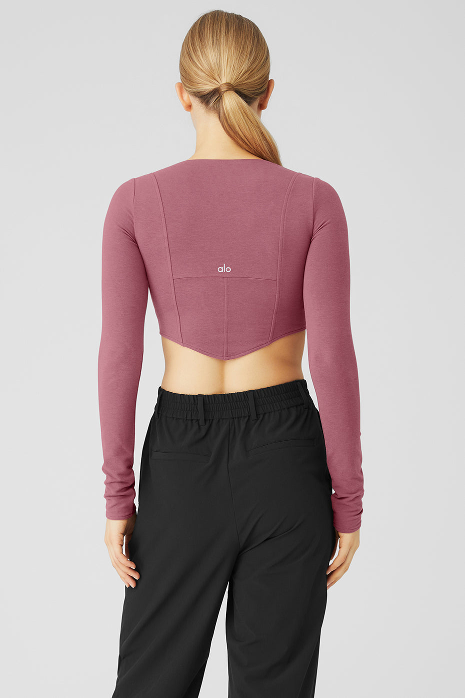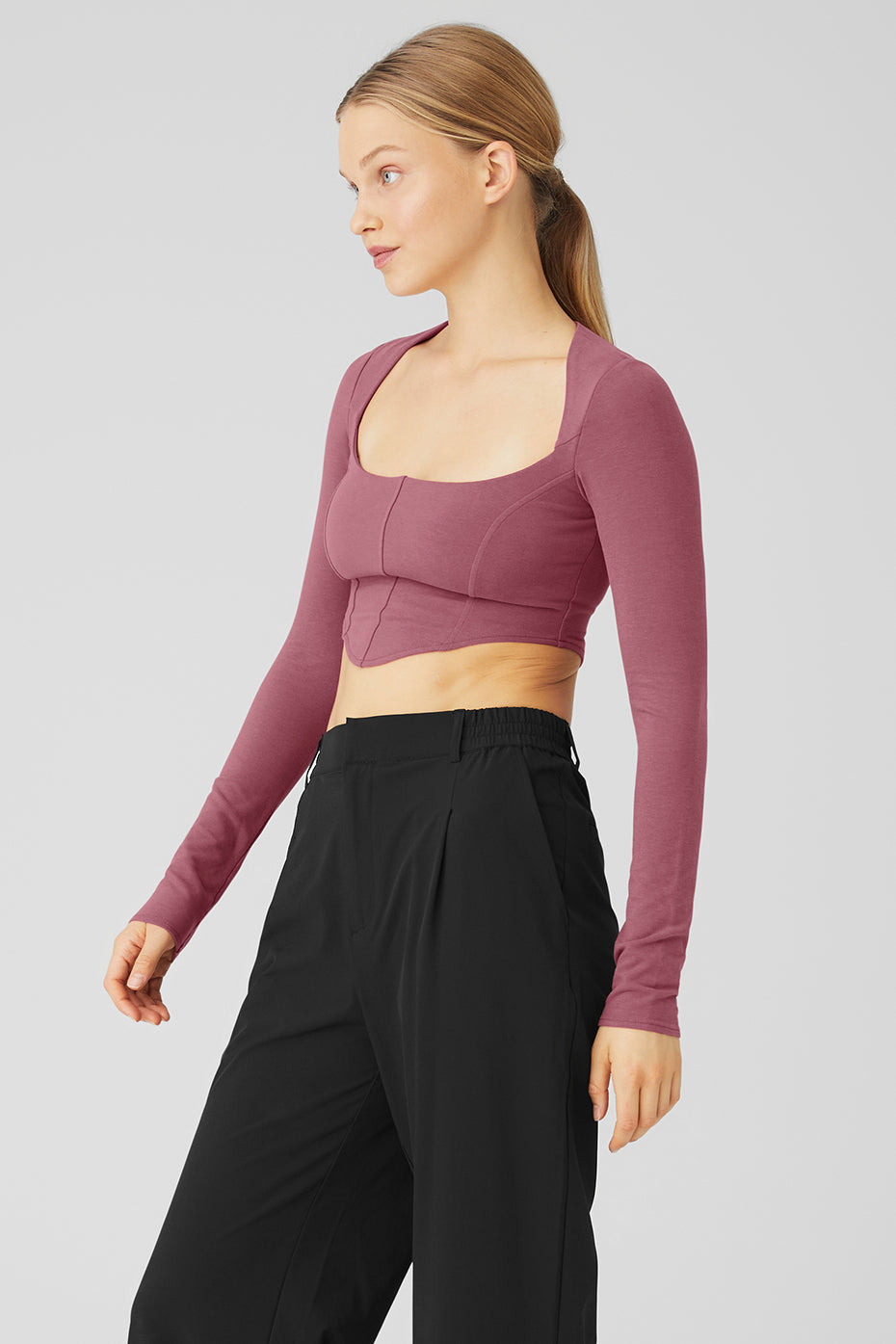 Corset panels shape super-soft micro French terry fabric into the street-sweet top of dreams. With long sleeves, princess seams and a sweetheart neckline, this crop top exudes L.A. cool girl vibes. Pair it with the matching ruched pant for a head-to-toe statement.