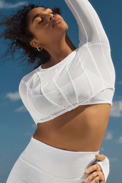Stop staring, start wearing. The Mesh Cropped Fine Line Long Sleeve combines ultra-fine, soft performance mesh with structured paneling and a curved front hem for a corset-inspired cropped, high-neck long sleeve. Complete the look with a tennis skirt or capri leggings.