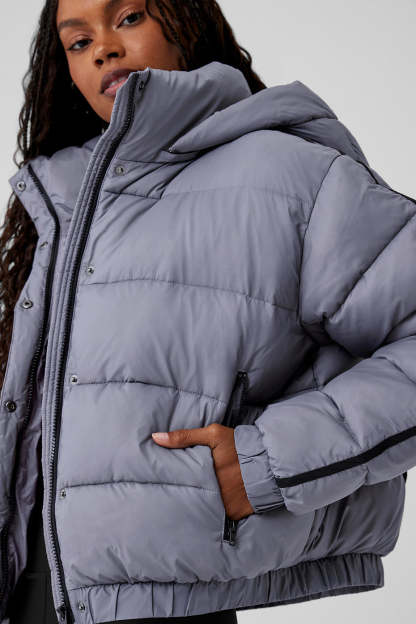 - Regular length puffer jacket hits at the hip
