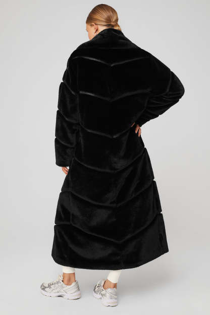 A forward take on the iconic, floor-length fur coat, the Faux Fur Cascade Jacket is a sweeping statement made in plush, unbelievably realistic, cruelty-free fur lined with satin. Buttery faux-leather chevron splicing creates depth and dimension, while an exaggerated shawl collar provides added warmth. Zippered front pockets and a hook-and-eye closure add functionality to this floor-length look.